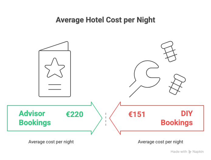 Travelers who book through advisors average €220 per night, while DIY bookings average €151.